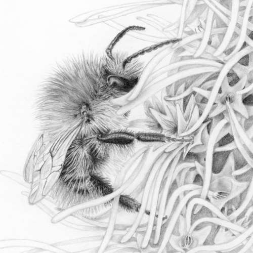 These are part of a series of bumblebee pencil drawings. The whole series will be on display in my Artweeks exhibition in Oxfordshire. Bumblebees I've observed in my garden often feature in my work, using all kinds of materials. I love how the more details I draw, the more I see, almost to an infinite extent. I find graphite pencil drawing very calming, focusing my mind completely, and aiming for mastery, so always trying to make the drawing I'm working on better than my last.